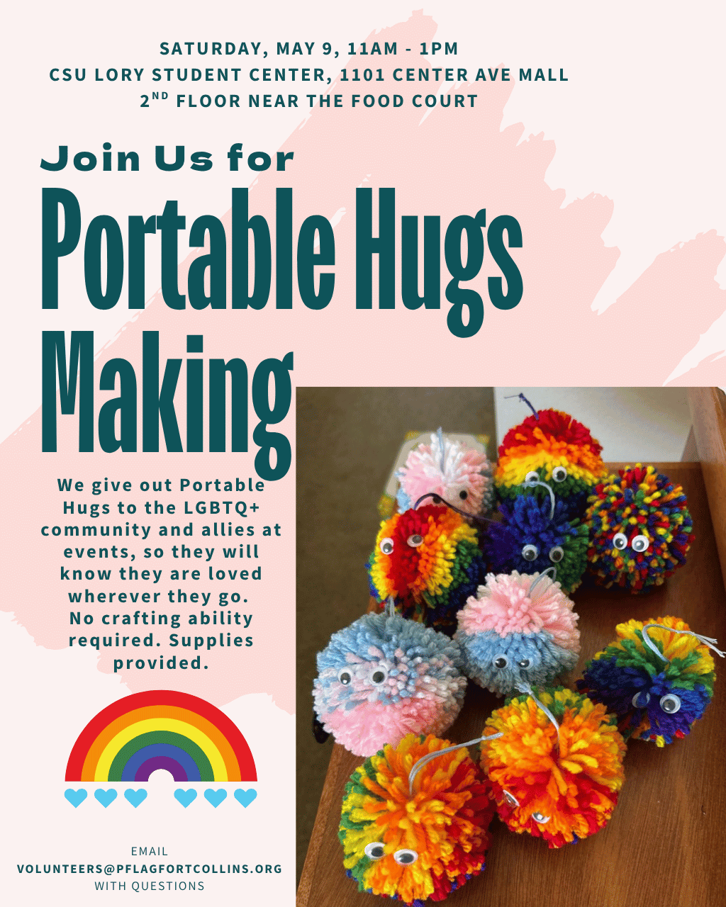 We give out Portable Hugs to the LGBTQ+community and allies at events, so they will know they are loved wherever they go. No crafting ability required. Supplies provided.